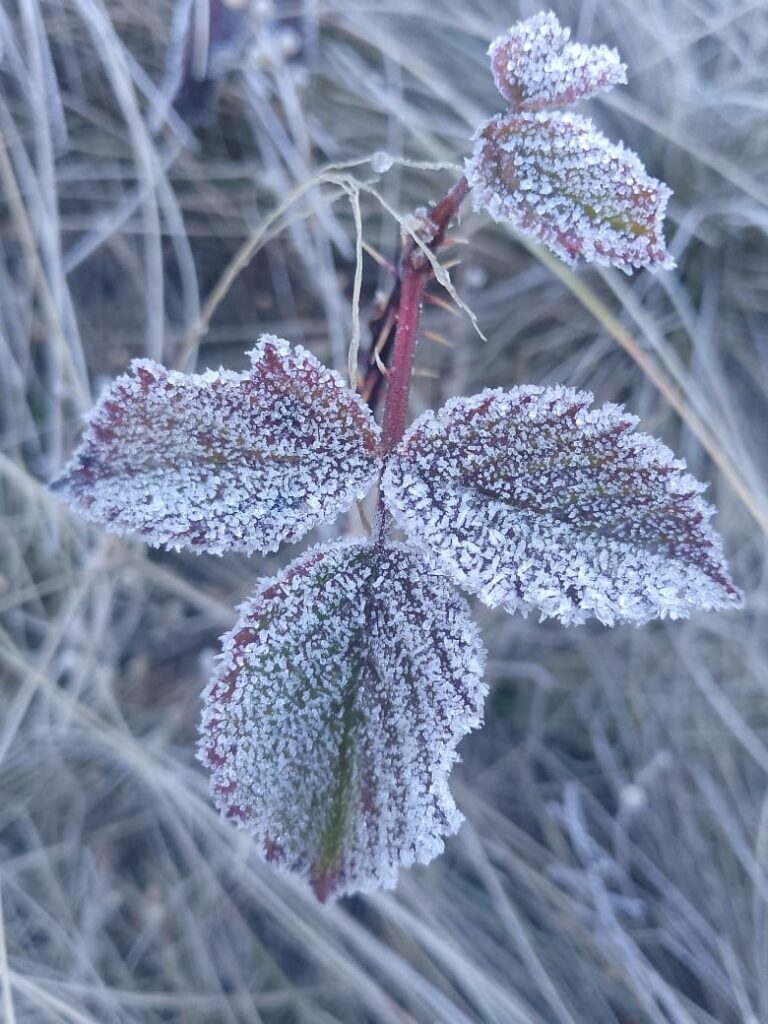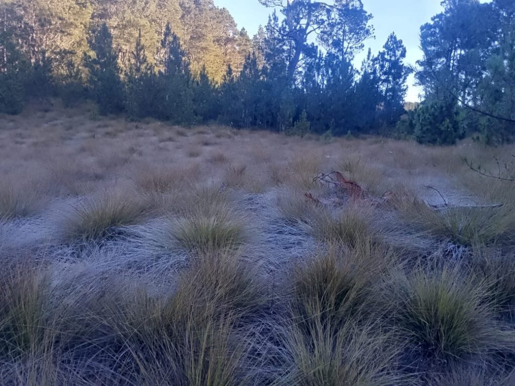 El descenso de 0 °C se registró en la zona de La Pirámide, lo que produjo pequeñas formaciones de escarchas y cencelladas en las hojas de mora silvestre.