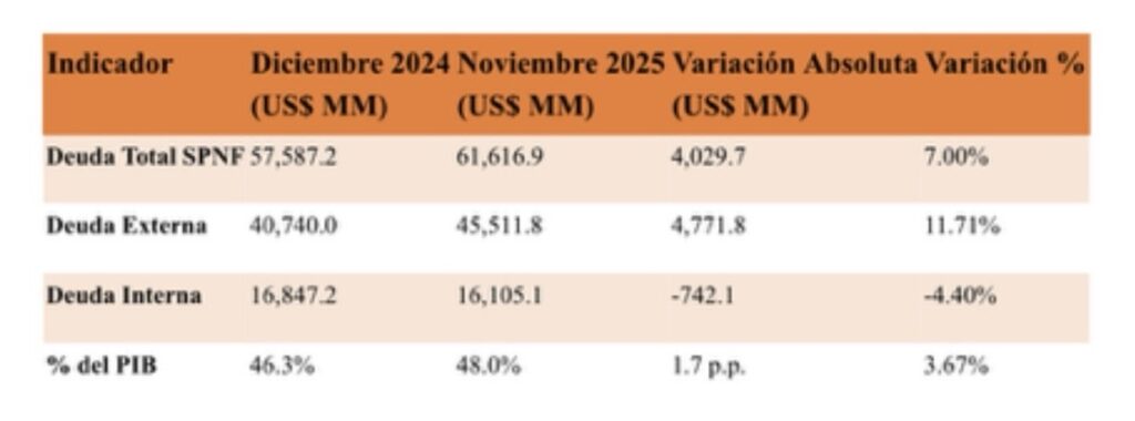 Al 30 de noviembre de 2025, el saldo de la deuda del SPNF totalizó US$61,616.9 millones, lo que representa el 48.0% del Producto Interno Bruto (PIB) estimado. La composición de la deuda se mantuvo predominantemente externa (73.9%), mientras que la deuda interna representó el 26.1%.