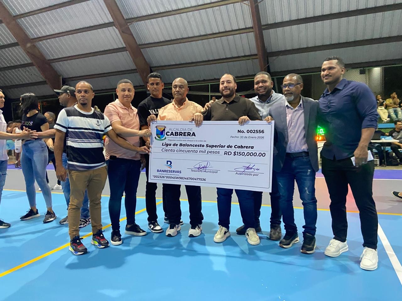 Pie de foto: Gaby Fernández alcalde de Cabrera entrega un aporte al comité organizador del noveno torneo de baloncesto superior de Cabrera que organiza el periodista Fidias David Cuevas.